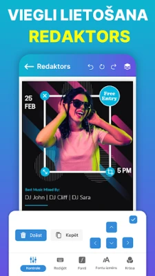 Lietotnes lietotājam draudzīgais interfeiss nodrošina, ka ikviens var kļūt par dizaineri. Vienkārši izvēlieties veidni, pielāgojiet to ar pieejamajiem rediģēšanas rīkiem – tekstu, uzlīmēm, efektiem, foniem – un jūsu darbs ir gatavs. Kad esat apmierināts ar rezultātu, varat to saglabāt savā ierīcē, ērti kopīgot ar citiem vai jebkurā laikā atkārtoti rediģēt. Atbrīvojieties no sarežģītas dizaina programmatūras ierobežojumiem un viegli izveidojiet profesionāla izskata materiālus, kas piesaistīs uzmanību un efektīvi nodos jūsu vēstījumu.