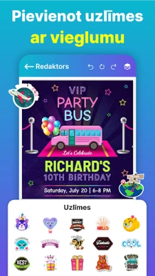 Šī vispusīgā platforma piedāvā neierobežotas iespējas plakātu, skrejlapu, brošūru, reklāmkarogu, sludinājumu un ielūgumu izstrādei. Neatkarīgi no tā, vai vēlaties veicināt sava uzņēmuma pārdošanu sociālajos tīklos vai radīt unikālus ielūgumus kāzām, jubilejām, Ziemassvētkiem vai Helovīnam, lietotne piedāvā pilnu rīku komplektu. Izvēlieties no daudzveidīgiem foniem vai augšupielādējiet savus attēlus, eksperimentējiet ar neskaitāmiem fontiem un teksta stiliem, pievienojiet skaistus efektus un saistošas uzlīmes. Varat strādāt ar vairākiem slāņiem, bloķējot un atbloķējot elementus, lai panāktu precīzu kompozīciju.